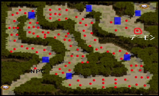 最後のボスはデーモン。沸くときにカメラが強制的に沸き位置まで動くので、その間はマウスが使えなくなるが、キーボードの上下キーで動くことができる。小マップでキャラクター位置を確認しながら上下キーを使ってデーモンの所まで移動し、沸いた瞬間に攻撃を加えることもできる。